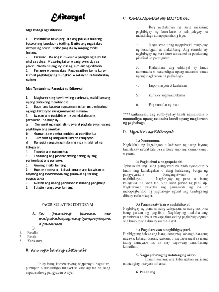 Editoryal o Pangunahing Tudling Bahagi ng pahayagan na nagsisilbing sama-samang paniniwala o kuro-kuro ng mga kawani ng pahayaganLayunin nitong magbigay-linaw sa mga isyu o kaganapanMaaaring magbigay-puna o papuri ang isang editoryal. Ang English na bersyon ang opisyal na wikang ginagamit namin para ipatupad ang aming mga patakaran. Sa ilalim ng batas na ito ipinagbabawal ang paninigarilyo sa pampublikong lugar at mga confined o enclosed areas gaya ng ospital.